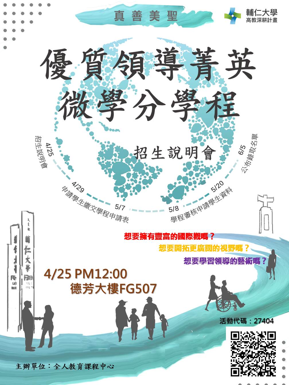 輔大公告信:108學年度「優質領導菁英微學分學程」招生說明會4月25日中午