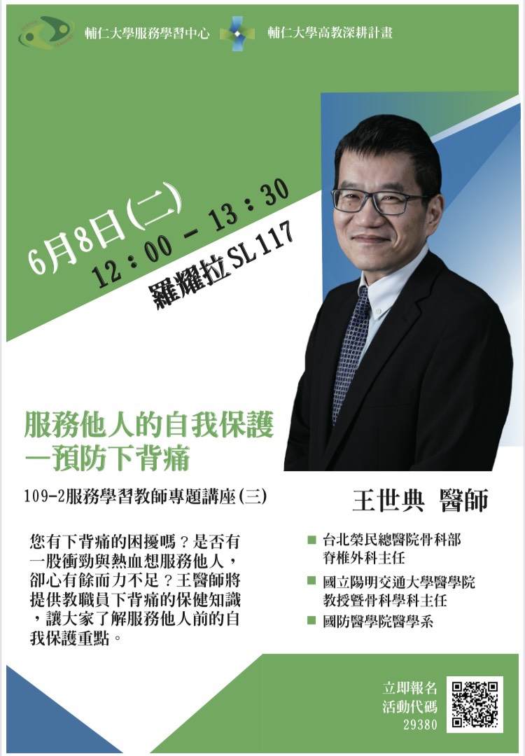 (延期)109-2服務學習教師專題講座(三):服務他人的自我保護–預防下背痛