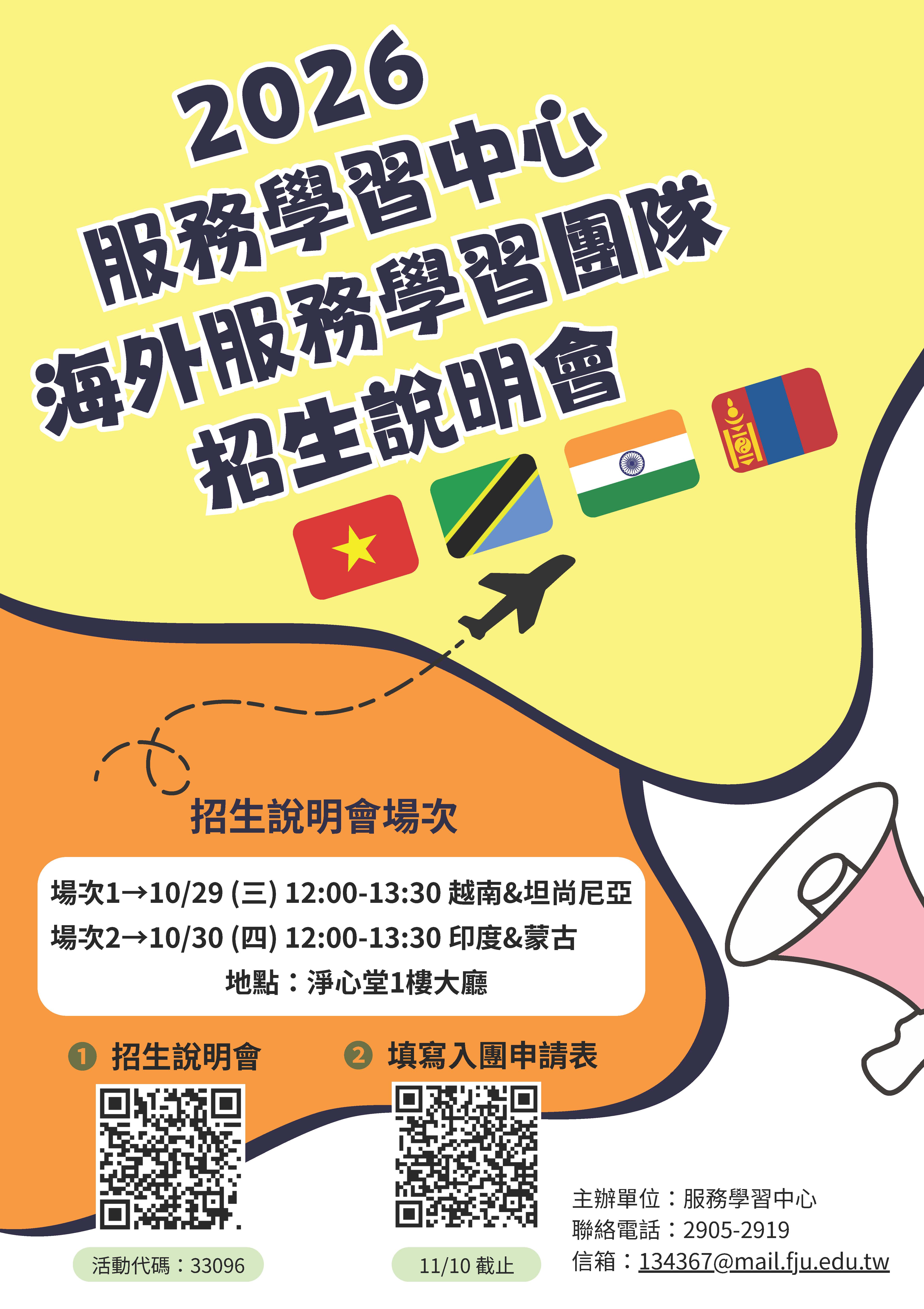 【開始報名!】服務學習中心📢📢📢 2026 海外服務學習團隊招生說明會來了!