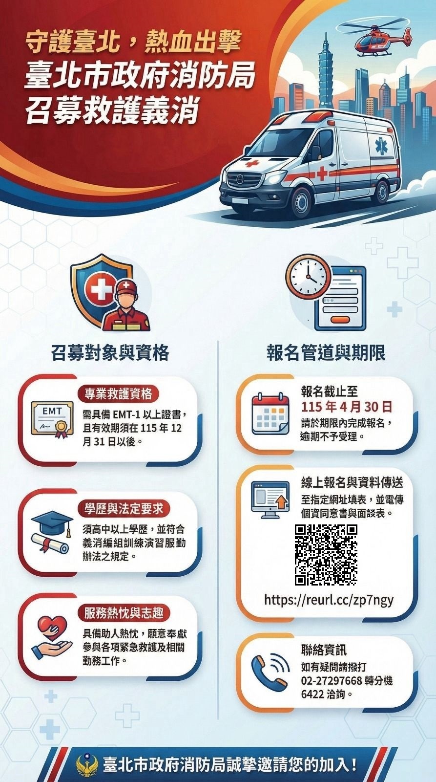 一、為廣邀本市各大專院校優秀人才投入緊急救護志願服務行列,即日起至115年4月30日辦理救護義消召募,誠摯邀請具專業能力與服務熱忱人員,一同站上第一線,為城市生命安全盡一份心力;相關資訊如下: