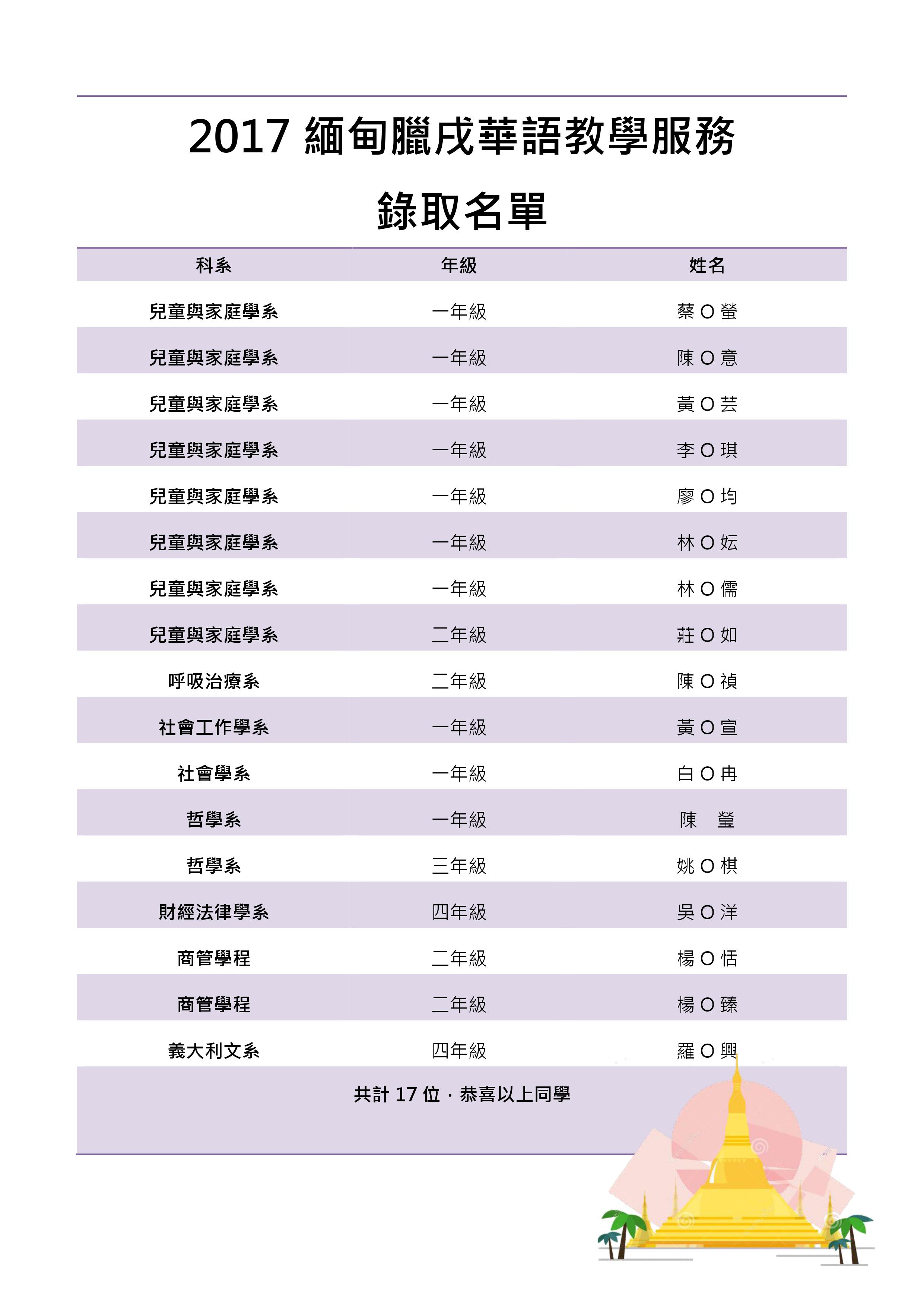 2017海外服務學習聯盟錄取名單已經正式出爐啦~~
