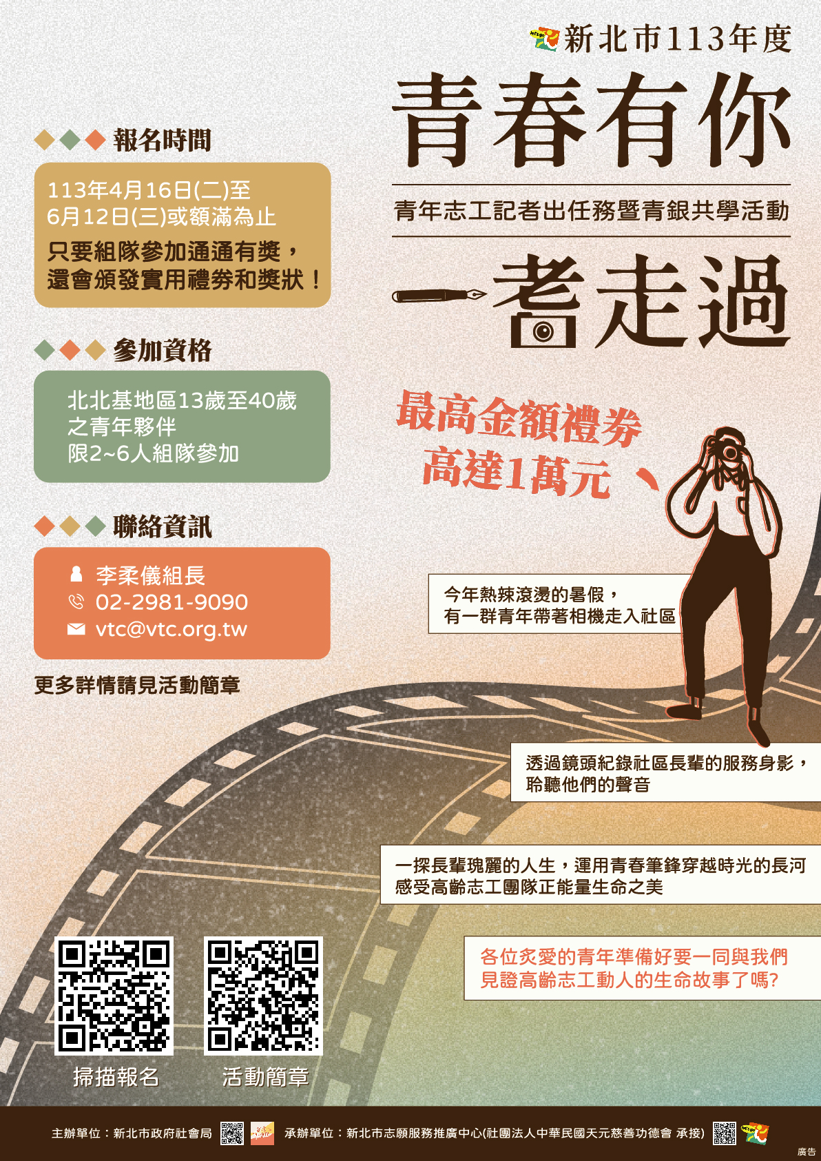 二、為鼓勵青年學生踴躍參與社會公益,新北市政府社會局委託新北市志願服務推廣中心於本(113)年4月16日(二)至6月12日(三)辦理活動「『青春有你 一耆走過』新北市113 年度青年志工記者出任務暨青銀共學活動」。